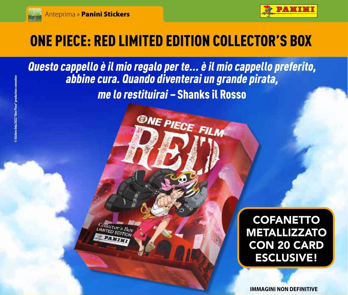 | In esclusiva a Lucca Comics, su sito della Panini e solo nelle migliori fumetterie potrai trovare un piccolo tesoro: One Piece: Red Limited Edition Collector's Box! Un successo straordinario per il nuovo capolavoro firmato Goro Tanigushi e Tsutomu Kuroiwa che vede tra i personaggi principali Shanks, temuto e rispettato Imperatore della saga One Piece. Questa collezione per la prima volta riunisce i mitici pirati della ciurma di Cappello di Paglia, i nuovi personaggi di One Piece Film: RED, insieme ai tanto attesi pirati della ciurma di Shanks il Rosso. All'interno di ONE PIECE: RED LIMITED EDITION COLLECTOR’S BOX, il prezioso cofanetto metallizzato raccoglie20 card esclusive con effetti speciali interamente dedicate al film. Oltre alle card speciali, il Box contiene un mini booklet con tante interessanti curiosità sul film! Il cofanetto uscirà ad Ottobre al costo di € 16,90. ![]() |